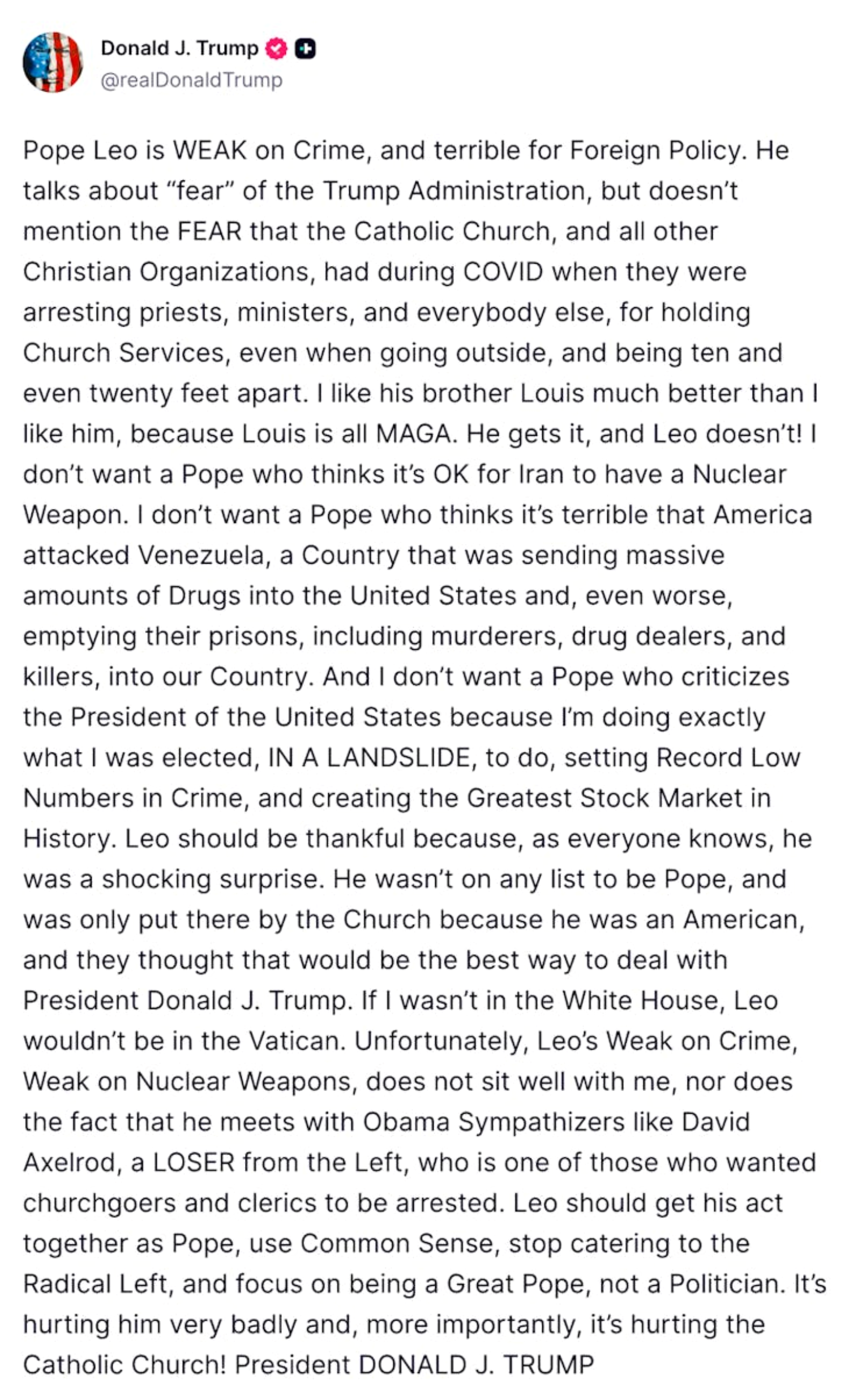 Donald Trump kritisiert Papst Leo XIV. scharf. Er postet ein KI-