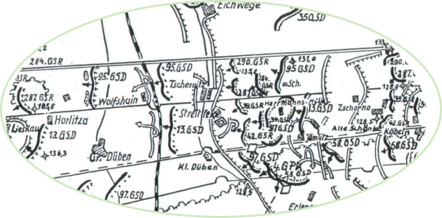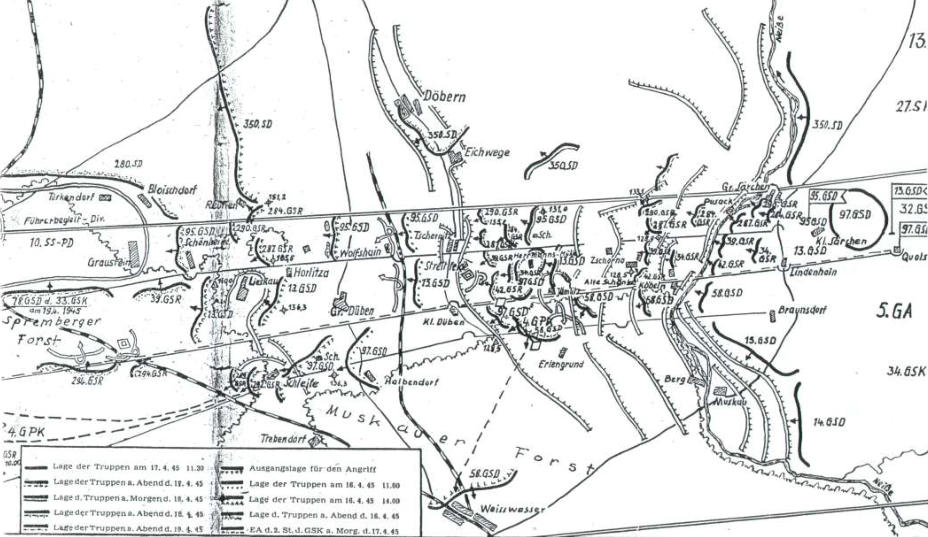 Die Karte zeigt den Verlauf der Kampfhandlungen des 32. GSK der 5. GA beim Durchbruch der Verteidigung des Gegners vom 16. bis 18. April 1945  Da das deutsch- faschistische Oberkommando einen entscheidenden Angriff in der Berliner Richtung erwartete, maß es dem Halten der Verteidigung im Neiße- Abschnitt besondere Bedeutung bei und ging aus diesem Grunde schon im Februar 1945 dazu über, eine starke Verteidigung vorzubereiten.  Mitte April 1945 bestand die Neiße- Verteidigung des Gegners aus drei Verteidigungsstreifen und einer Reihe von Zwischen- und Riegelstellungen.